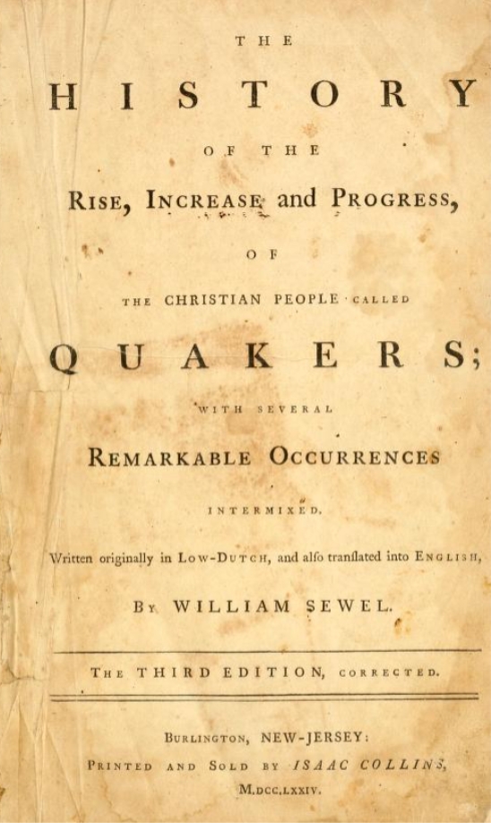 The result of 25 years of his labor, Sewel first published his History in Holland in 1717. It was translated into English and printed in London in 1722. The edition in possession of our library was printed, we believe (the original title page is missing), in New Jersey in 1774. Thanks to the generosity of a Meeting member, this remarkable text is presently in circulation.